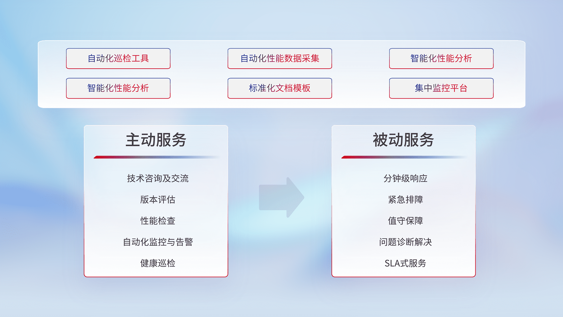 智能化工具和标准化文档,,保障服务质量,,提供主动服务(包含技术咨询、、版本评估、、性能检查、、、、自动化监控与告警、、健康巡检)和被动服务包含(分钟级响应、、紧急排障、、、值守保障、、、问题诊断解决、、、SLA服务)。。。。