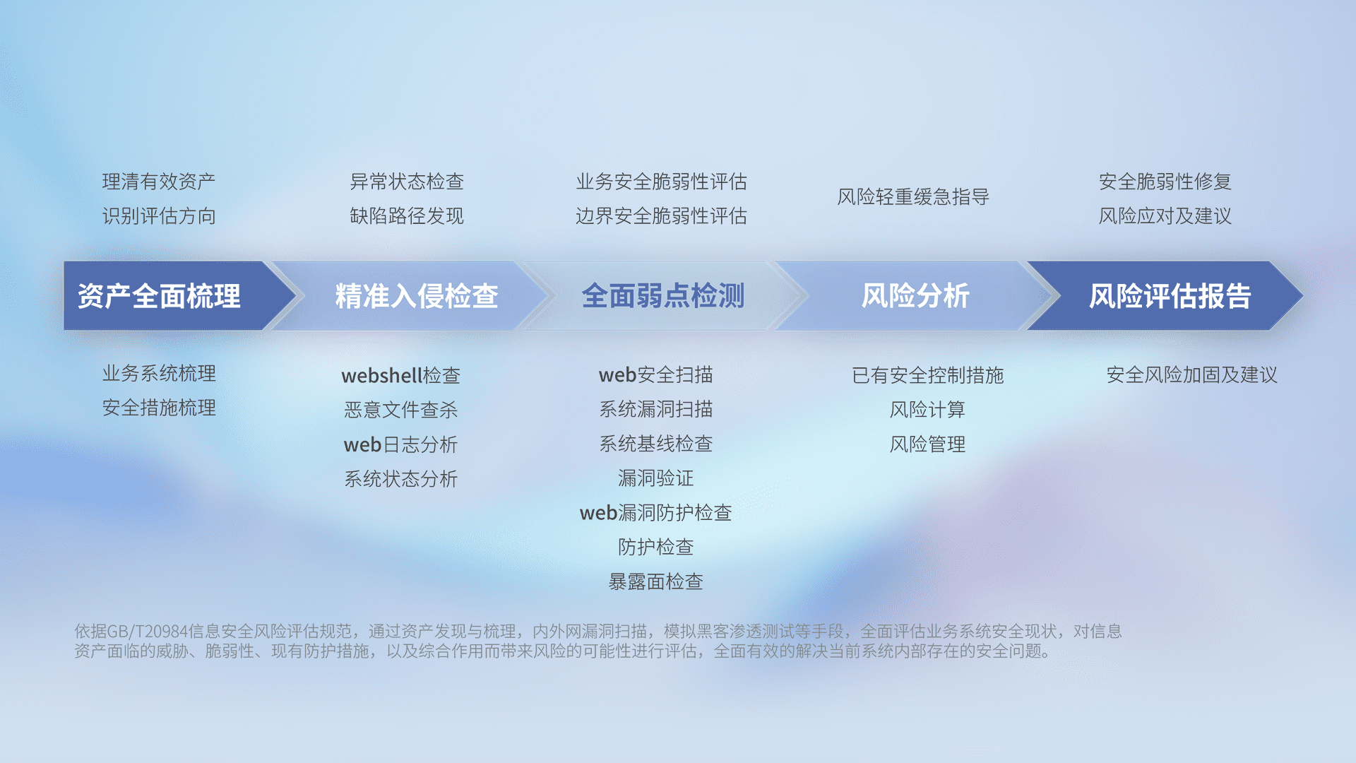 针对客户行业特性,,,以专业的安全服务+多厂商联合解决方案提供专属的一站式安全管理服务,,帮助客户全面感知网络空间威胁,,,,基于识别、、、检测、、、分析、、、、防护、、监测、、、、响应的服务理论模型,,,从方案咨询、、、集成交付、、、评估验证、、优化加固、、运维运营,,,致力于为客户提供完整的闭环管理式安全服务。。。。以实战经验为客户打造高抵御风险的安全体系,,,,帮助客户发现威胁、、、、对抗威胁、、、、处置威胁,,,不断积累安全对抗能力,,,,持续保障数字化安全。。。。