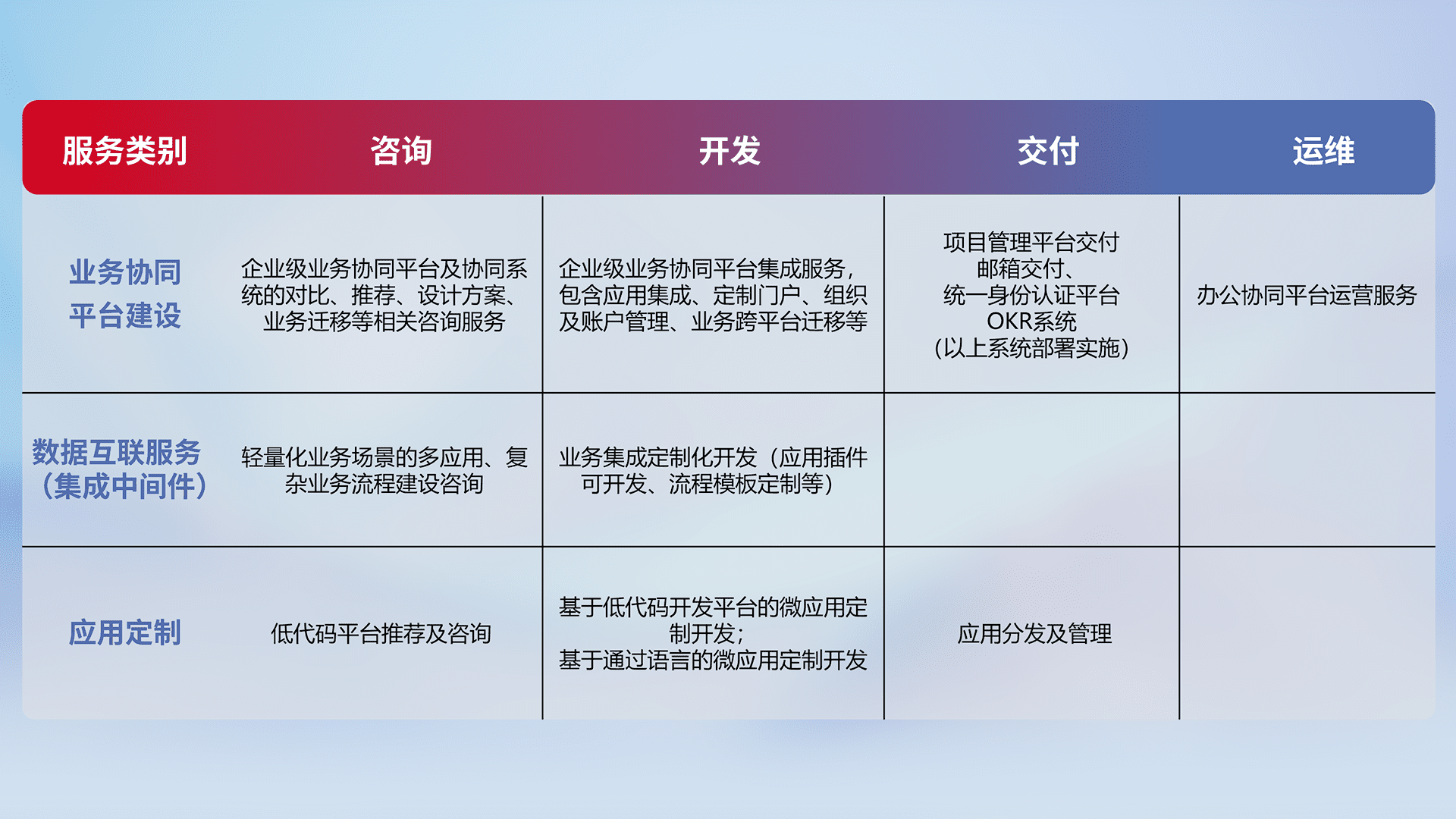 针对钉钉、、企微、、、IDaas等平台级产品提供产品的规划、、方案、、交付、、、定制化开发等服务,,,,实现如统一协同办公、、、、智能客户服务、、混合会议管理、、、、智能数据查询、、、、等业务场景,,,实现数字化转型。。。。